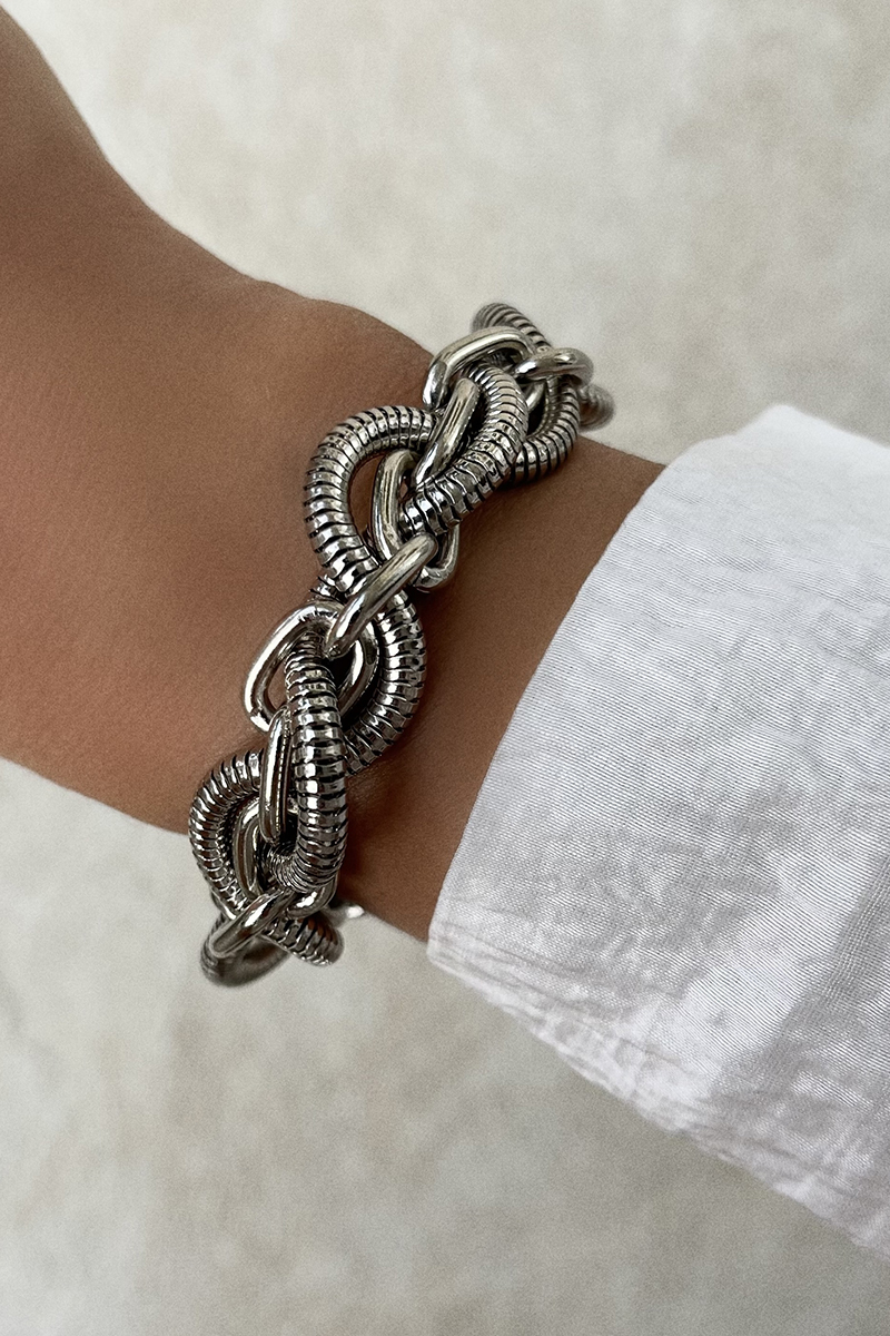 Pulseira trançada por corrente de elos e corrente rabo de rato, no banho prata.