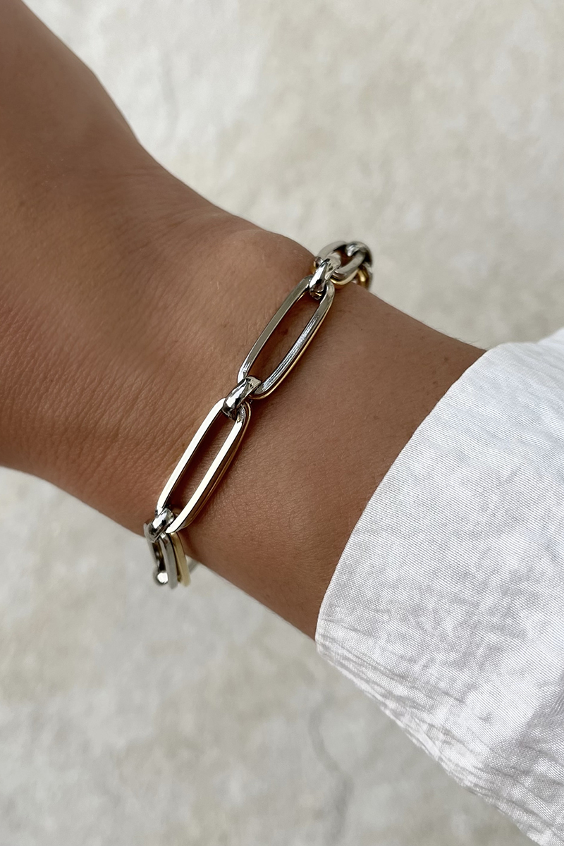 Pulseira formada por elos cartier alongados no mix de banhos prata e dourado.